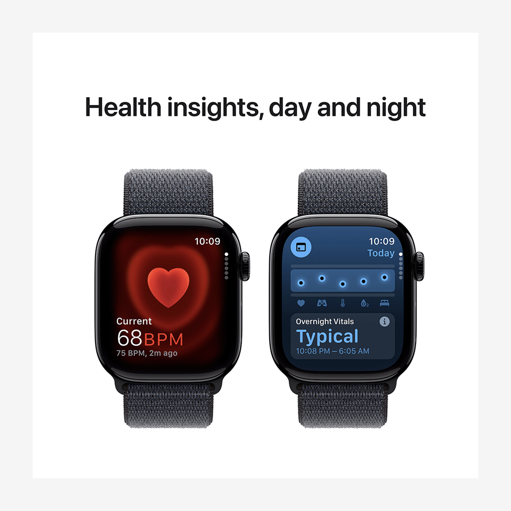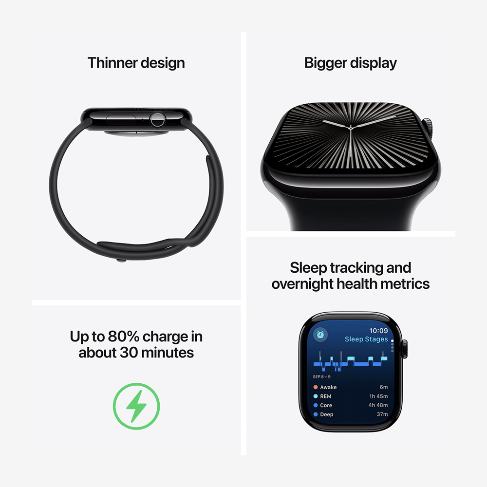 Meet Apple Watch Series 10. A bigger display with more screen area and a thinner, lighter design. Get advanced fitness and health features, plus faster charging.
